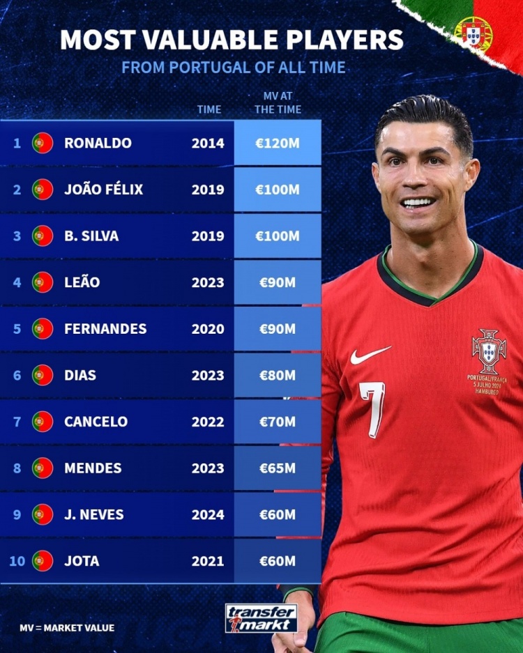 葡萄牙球员德转历史身价榜:C罗1.2亿欧居首,菲利克斯、B席1亿欧