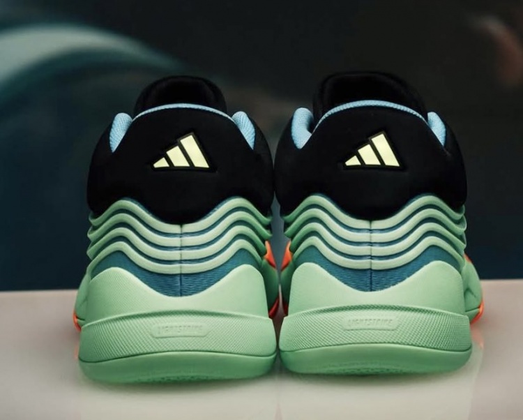 可以看到,The Dame X在整体设计上与9代战靴相比变动不大,鞋侧波浪形褶皱颇具流动性和层次感,也将阿迪的三道杠标志相呼应。鞋身浅绿和鞋头明橙的撞色也很有冲击力。