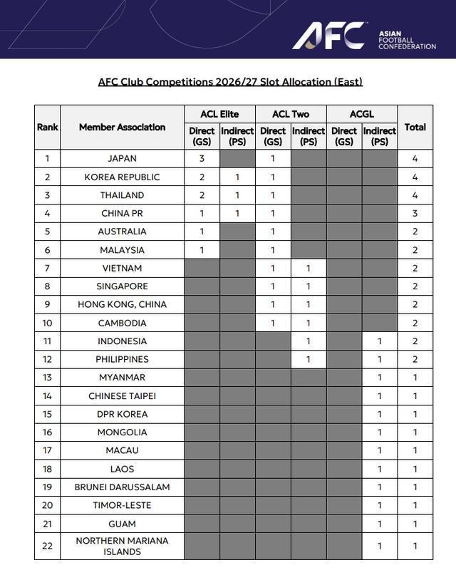 泰超2个亚冠精英赛正赛、1个亚冠精英赛附加赛、1个亚冠2。