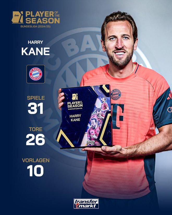 - 德甲 | 官方:凯恩获评德转202425赛季德甲最佳球员