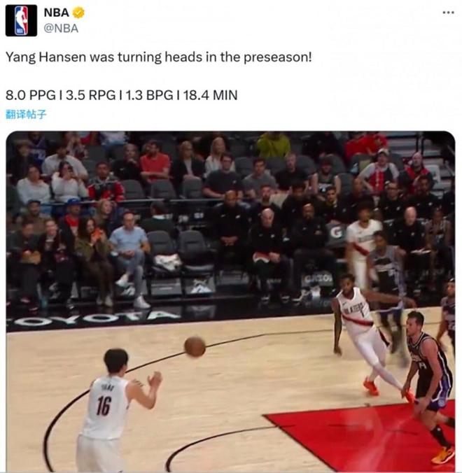 NBA官方更是直接晒出杨瀚森季前赛表现,场均出战18.4分钟,可以得到8分3.5板1助攻1.3帽。并且配文称赞道:“杨瀚森季前赛表现抢眼!”可见无论是开拓者内部,还是NBA官方,对于杨瀚森季前赛的表现都是认可与称赞,并且十分期待他在新赛季常规赛的表现。
