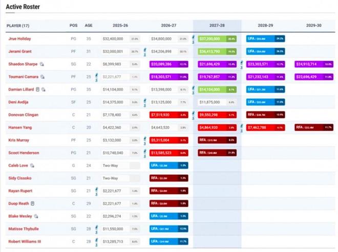 第一大利好:更加稳定的阵容过去几个赛季开拓者队都处于无序的摆烂重建之中,随着豪掷1.72亿续约两大新星,开拓者队正在敲定未来3年的建队核心阵容。目前开拓者大名单中共有8名球员手握至少3年合同:利拉德、格兰特、夏普、卡马拉、阿夫迪亚、霍勒迪、克林根、杨瀚森。稳定的人员名单意味着稳定的化学反应与队内环境,对于年轻杨瀚森的成长无疑是巨大的利好。