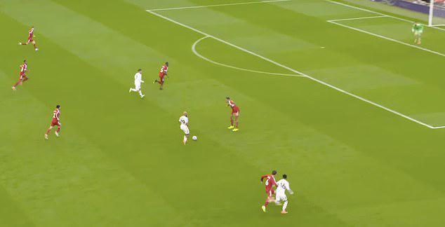 第30分钟,随着姆伯莫向前推进,迪亚洛拉开边路。凯尔凯兹不得不跟随迪亚洛的跑动以防姆伯莫传球给他,这使得范戴克陷入一对一的不利局面。