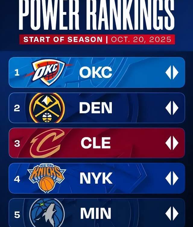 雷霆又一次登顶了!新赛季开赛在即,NBA官方公布的新赛季首期实力排行榜,卫冕冠军雷霆依旧高居第一。而在雷霆之后,还有不少值得关注的意外惊喜。