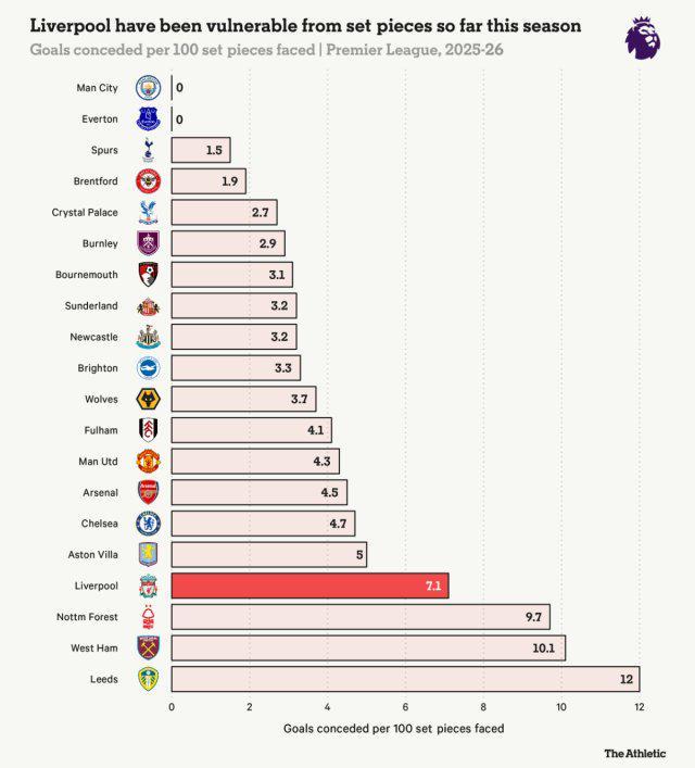 利物浦4连败后,定位球成为槽点之一。上周双红会,曼联藉由角球攻入致胜球,这是利物浦本季英超70次定位球防守中第5次失守,只有诺丁汉森林(6)、利兹(6)、西汉姆(8)丢球数更多。若换算为每100次定位球防守的丢球数,利物浦的7.1明显落后于英超通常水平(图2)。而定位球进攻,利物浦也是英超倒数第4,索博斯洛伊对阿森纳的直接任意球,是他们本季57次定位球进攻唯一的斩获。上月,红军调整助教布里格斯的分工,令其专门负责定位球,显然尚未收到成效。