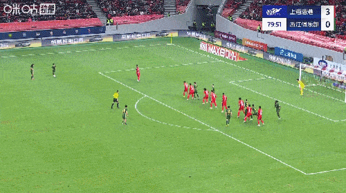 第72分钟,维塔尔主罚禁区前沿任意球,他直接射门皮球绕过人墙飞入球门上角,赵博毫无办法,海港3-0领先浙江。