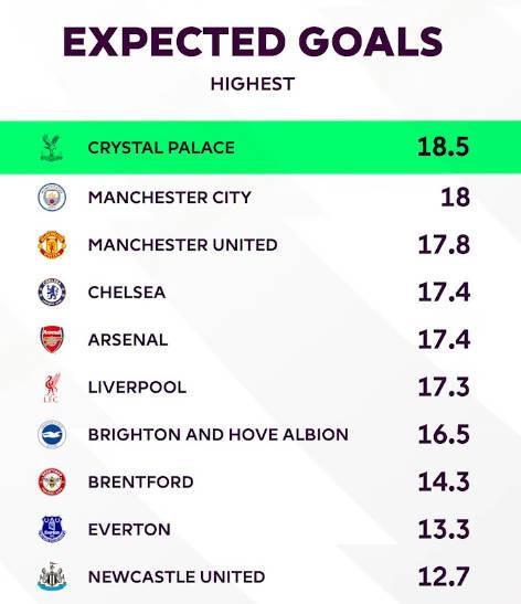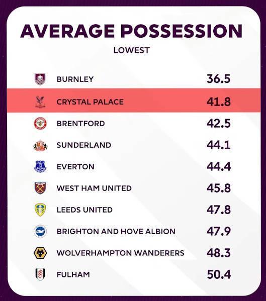 水晶宫是本赛季至今英超控球率第二低球队,但预期进球数最高