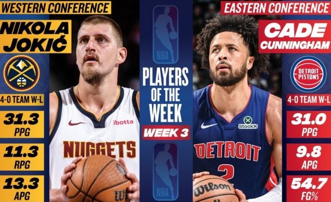 第一则:周最佳球员诞生,康宁汉姆约基奇当选NBA官方公布了第3周的东西部周最佳球员,东部由活塞后卫康宁汉姆当选,西部由掘金中锋约基奇当选。康宁汉姆上周场均砍下31分+9.8助攻,带领活塞取得4胜0负的战绩,登顶东部第1!据统计,这是康宁汉姆生涯第2次拿到该奖项。约基奇上周场均豪取31.3分+11.3篮板+13.3助攻,带领掘金取得4胜0负的战绩。据统计,这是约基奇生涯第18次获此殊荣,队史最多!值得一提的是,字母哥、杜伦、克尼佩尔、米切尔、鲍威尔、唐斯、布克、亚历山大、墨菲、兰德尔和申京等人获得了周最佳提名。