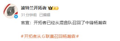 11月2日,开拓者官宣,球队已将中国球员&今年首轮16号秀杨瀚森下放至球队的发展联盟下属球队撕裂之城混音进行例行训练。据荆楚网,开拓者队记SeanHighkin报道,开拓者此举是为了让杨瀚森收获更多的训练时间,并且他将在周一与湖人的比赛中重回球队。11月3日,@波兰特开拓者官宣:我们已经从发展联盟混音队召回了中锋杨瀚森。