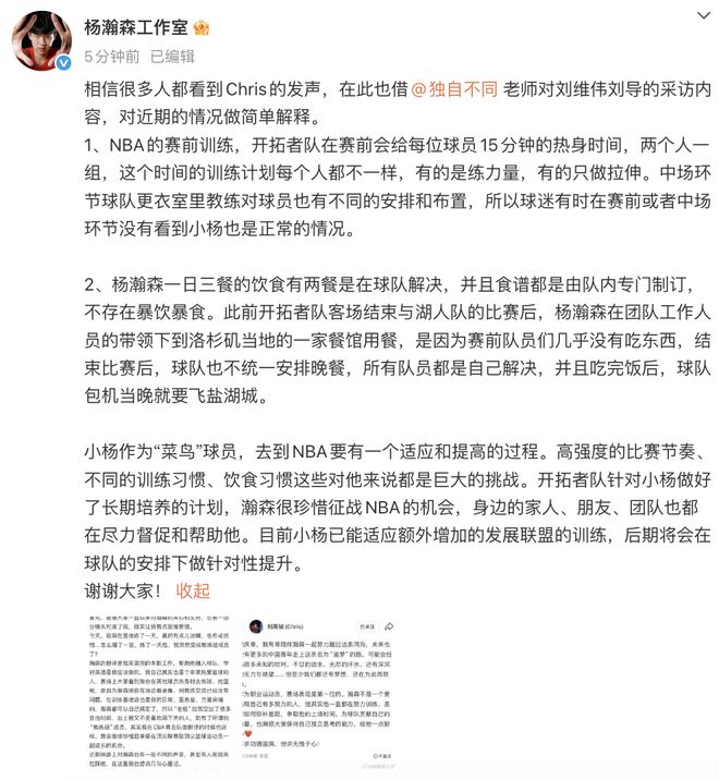 11月5日,据白鹿视频报道,@杨瀚森工作室发文回应杨瀚森近期争议。全文如下:1、NBA的赛前训练,开拓者队在赛前会给每位球员15分钟的热身时间,两个人一组,这个时间的训练计划每个人都不一样,有的是练力量,有的只做拉伸。中场环节球队更衣室里教练对球员也有不同的安排和布置,所以球迷有时在赛前或者中场环节没有看到小杨也是正常的情况。2、杨瀚森一日三餐的饮食有两餐是在球队解决,并且食谱都是由队内专门制订,不存在暴饮暴食。此前开拓者队客场结束与湖人队的比赛后,杨瀚森在团队工作人员的带领下到洛杉矶当地的一家餐馆用餐,是因为赛前队员们几乎没有吃东西,结束比赛后,球队也不统一安排晚餐,所有队员都是自己解决,并且吃完饭后,球队包机当晚就要飞盐湖城。小杨作为“菜鸟”球员,去到NBA要有一个适应和提高的过程。高强度的比赛节奏、不同的训练习惯、饮食习惯这些对他来说都是巨大的挑战。开拓者队针对小杨做好了长期培养的计划,瀚森很珍惜征战NBA的机会,身边的家人、朋友、团队也都在尽力督促和帮助他。目前小杨已能适应额外增加的发展联盟的训练,后期将会在球队的安排下做针对性提升。