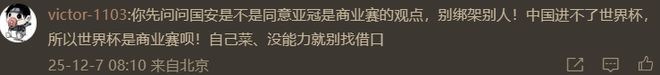 在陈华这动态的下面,有北京球迷表示不认同(上图),写道:“你先问问国安是不是同意亚冠是商业赛的观点,别绑架别人!中国进不了世界杯,所以世界杯是商业赛呗!自己菜、没能力就别找借口。”看来,国安球迷也有明事理不喜欢被忽悠的。