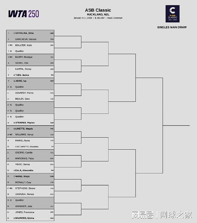WTA250奥克兰站:乌克兰小白菜斯维托丽娜和美国人纳瓦罗领衔出战;中国二姐王欣瑜被抽到了下半区,首轮对阵美国人麦克纳莉;大威廉姆斯也确认参赛,首秀的对手是波兰人里内特。另外,在奥克兰站女单资格赛首轮较量中,中国小将郭涵煜以4-6 0-6吞蛋不敌赫瓦林斯卡,无缘晋级。