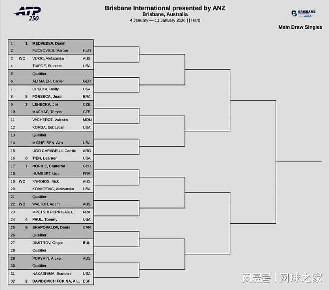 我们再来关注赛事签表。北京时间昨晚,下周开打的三站赛事相继公布了正赛签表。其中,ATP250布里斯班站由俄罗斯名将梅德维德夫领衔,西班牙人弗基纳、捷克人莱赫卡和美国人保罗分列2-4号种子;沙波瓦洛夫、丰塞卡等人也将参赛,澳大利亚坏小子克耶高斯持外卡在本站复出,首轮对阵美国人科瓦切维奇;梅总和椰子分处上下半区,如想交手,必须各自打进决赛。