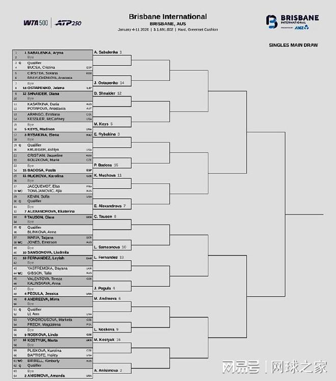 WTA500布里斯班站则是星光熠熠,多位TOP10球员出战。前八大种子的对位:上半区,萨巴伦卡--凯斯、莱巴金娜--亚历山德洛娃;下半区,陶森--佩古拉、米拉-安德列娃--阿尼西莫娃。双打方面:中国有四朵金花出战,其中张帅/萨姆索诺娃首轮迎战巴多萨/萨巴伦卡;蒋欣玗/詹皓晴对阵亚历山德洛娃/米拉-安德列娃;谢淑薇/奥斯塔彭科迎战盖德基/米哈利科娃。