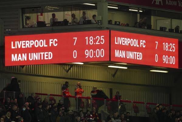 这是2022/23赛季英超第26轮的比赛结果,当时利物浦主场7-0战胜曼联,是曼联队史在英超遭遇的最惨痛失利之一。